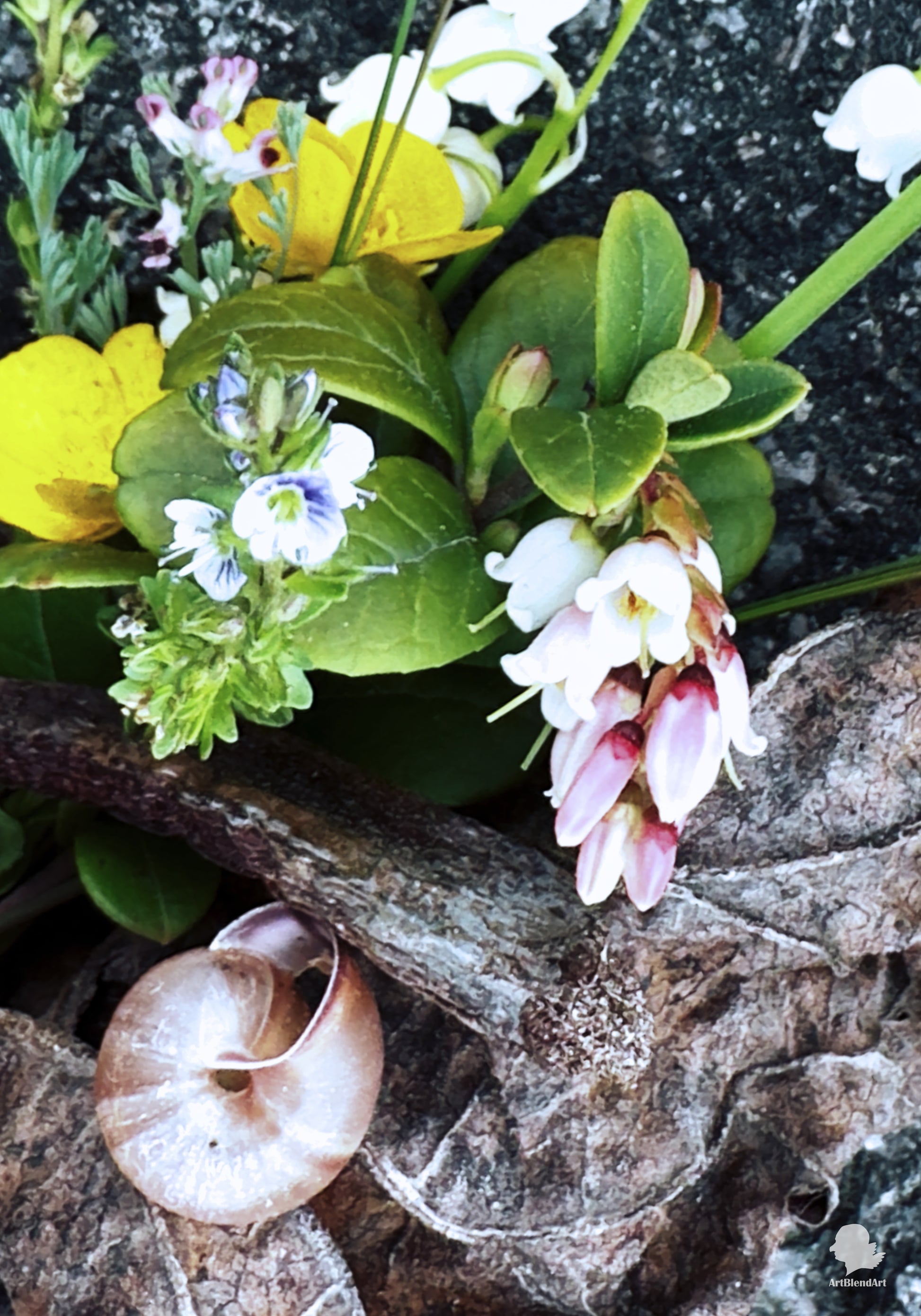 A quiet tribute from the forest floor—flowers, shell, and bark arranged by chance or unseen hands. Every element tells a story of fragility and renewal, life and decay intertwined. The image captures a moment of natural stillness that feels almost ceremonial, like a whispered gift left in plain sight.